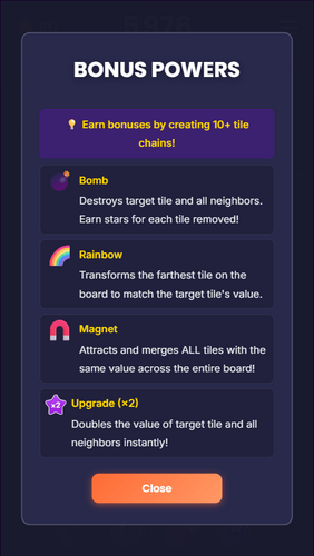 - Power-ups: Earn bombs, rainbows, magnets, and upgrades by creating 10+ tile chains